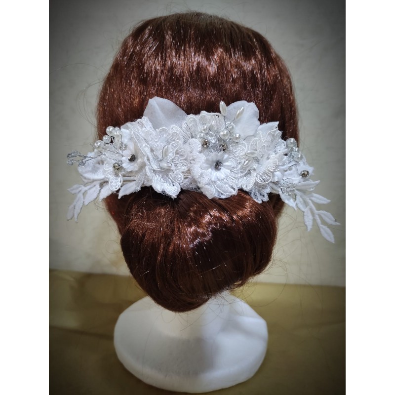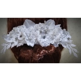 Tocado con pasador: en tono blanco con toques plata, guipur con puntos de luz en pedrería.
